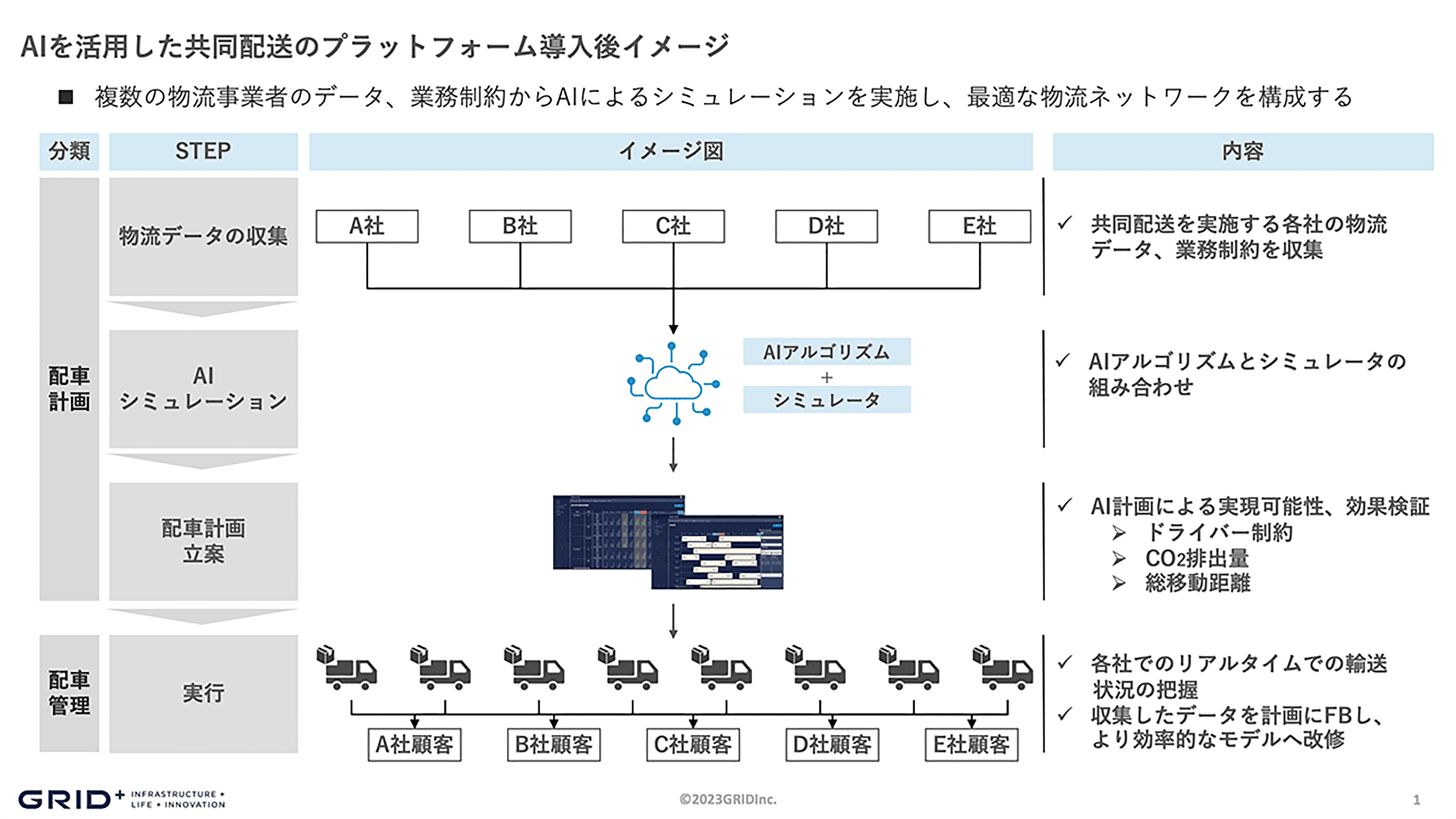 プログラム2では、グリッドのAI事業本部所属のコンサルタント・小林が、「物流の未来を変えるAI技術の現在地」と題して、物流業界が抱える課題を整理しながらフィジカルインターネット実現までのステップを紹介しました。 これまでGRIDがお客様の課題をヒアリングしてきた経験をもとに、ブラックボックス化している運送会社の運行状況の実態把握から配車計画の最適化、そしてフィジカルインターネットの実現までの進め方を紹介しました。