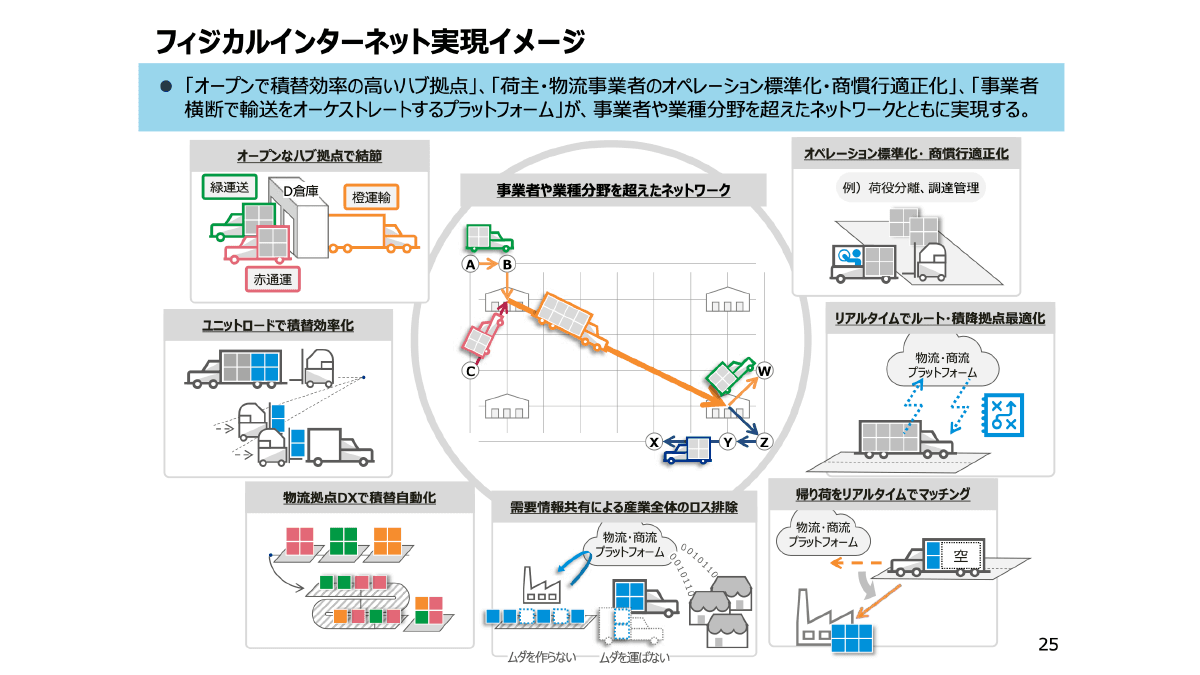 プログラム1では「フィジカルインターネット実現のロードマップ」と題して、中野様よりドライバーの人手不足による物流逼迫の現状と、2024年問題と称される物流危機を乗り越えるための政府の対策についてご説明いただきました。 政府が現在取り組んでいる各種システム導入によるDX化推進や、事業者や荷主だけでなく物流全体の改革を促進する各種施策、特に国レベルでは初めての取り組みとなる「フィジカルインターネット」ついてご紹介いただきました。フィジカルインターネットとは、業種を超えた共同輸配送システムを実現する取り組みであり、物流業界へ大きな変革をもたらすと期待されています。