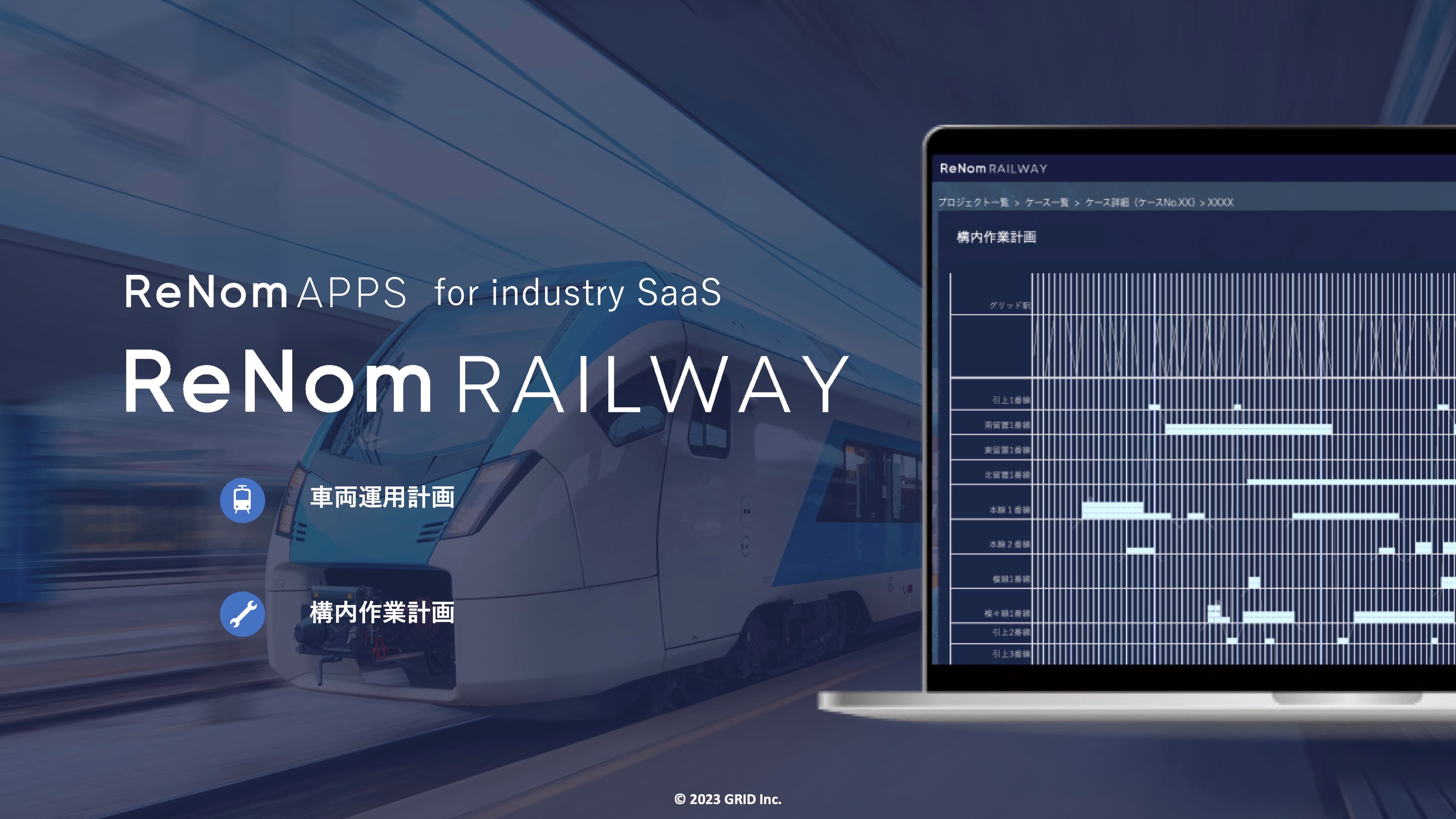 株式会社グリッド(本社:東京都港区、代表取締役:曽我部完、以下「グリッド」)は、社会インフラ特化型 SaaS「ReNom Apps for Industry SaaS」に、新たに追加する「ReNom Railway」を開発開始したことをお知らせいたします。「ReNom APPS for Industry SaaS」は電力・海運・サプライチェーン3分野のオペレーション最適化を実現する社会インフラ特化型 SaaSで、今回新たに追加される「ReNom Railway」のドメイン分野は鉄道分野向けのソリューションです。