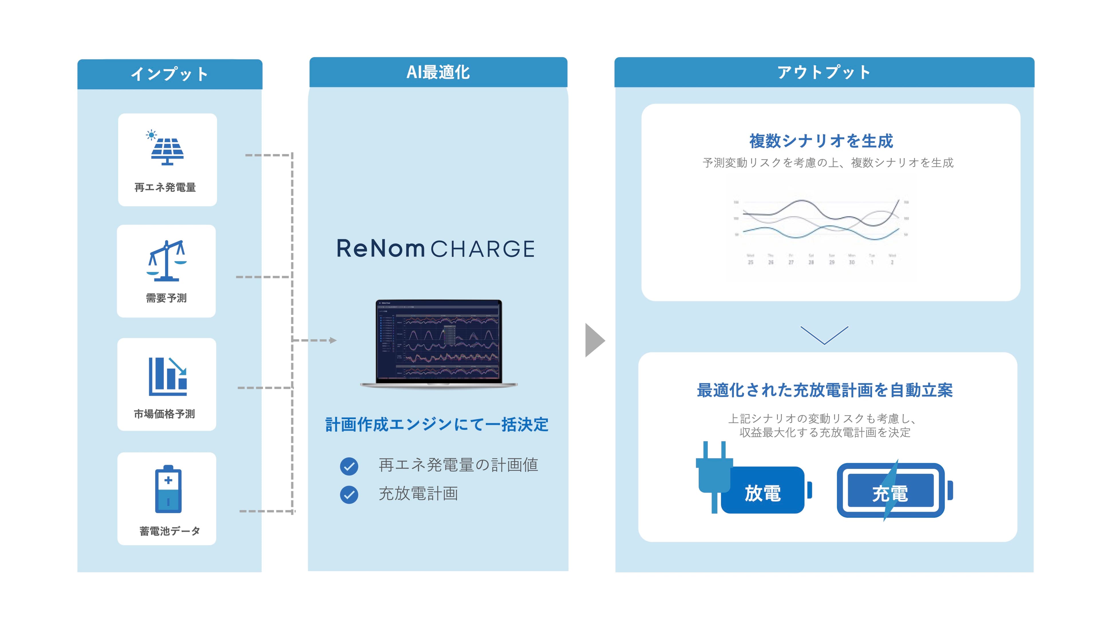 昨今、脱炭素化社会の実現に向けて太陽光など再生可能エネルギーの導入が加速する中で、GXとして再生可能エネルギーを有効活用できる蓄電池の需要が高まっています。特に、電力系統に接続する蓄電池は、市場取引による収益化や、自社の工場、オフィスでの需要ピーク時に放電することによるエネルギーコスト及びCO2排出量の削減を可能とします。しかし、収益最大化やCO2排出量最小化を達成するためには、再エネ発電量や電力需要、市場価格などの予測データをもとに複雑な分析を行い、最適な充放電計画を立案する必要があります。また、それぞれの予測データに予測誤差は必ず生じるため、精度の高いシナリオを策定することは難しく、蓄電池の効果的な運用には課題があります。