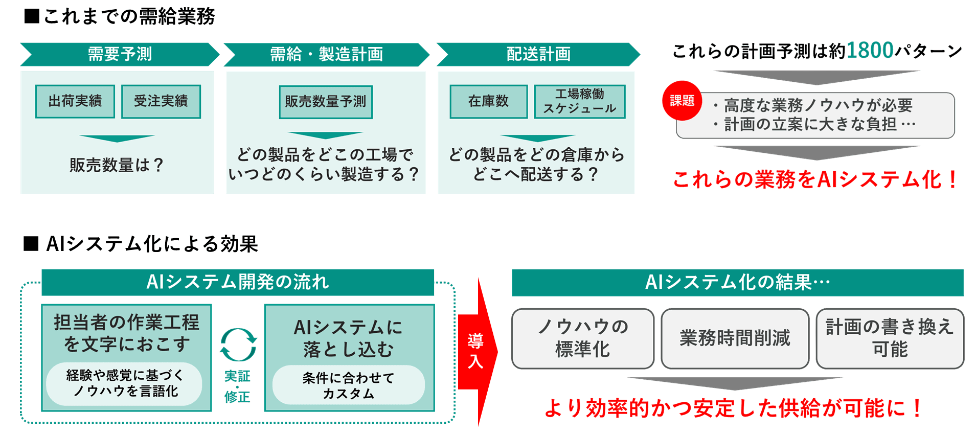 これまで日清製粉ウェルナでは、冷凍食品の需給管理と配送に関する各計画の立案を専門の担当者が担っていましたが、これらの計画予測の組み合わせは約1800パターンにものぼるため担当者に大きな負担がかかっており、業務の自動化が強く求められていました。