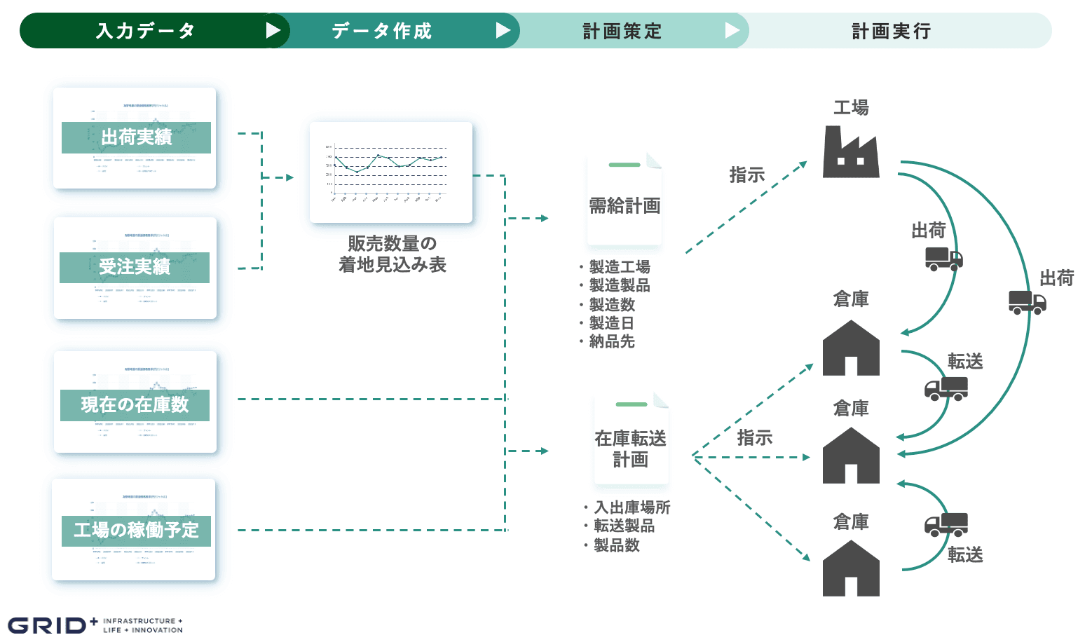 こうした背景の中、日清製粉ウェルナが培った高度な業務ノウハウと、グリッドのAI技術を組み合わせ、需給管理の自動化システムを開発しました。今回開発したシステムでは、需給計画(製造計画)および在庫転送計画の自動策定が可能となりました。