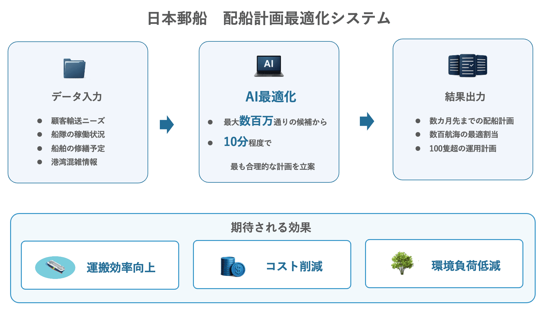 日本郵船では、世界最大規模である100隻超の自動車専用船を運航しています。これまで輸送配船計画業務は、数カ月先までの数百航海に対し多様な条件を総合的に考慮する必要があり、極めて複雑かつ属人的なものになっていました。