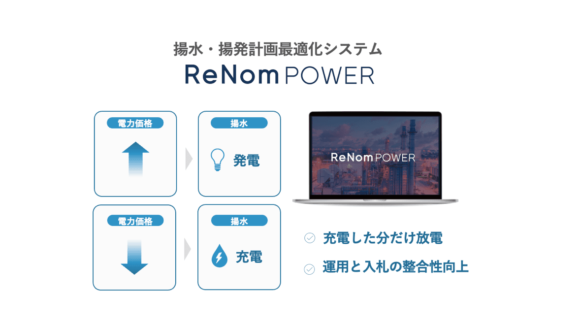 「ReNom Power」では、揚水と発電の稼働を最適化し、運用計画を策定します。あわせて、「充電した分だけ放電」する一貫した入札により、運用との整合性を高めます。