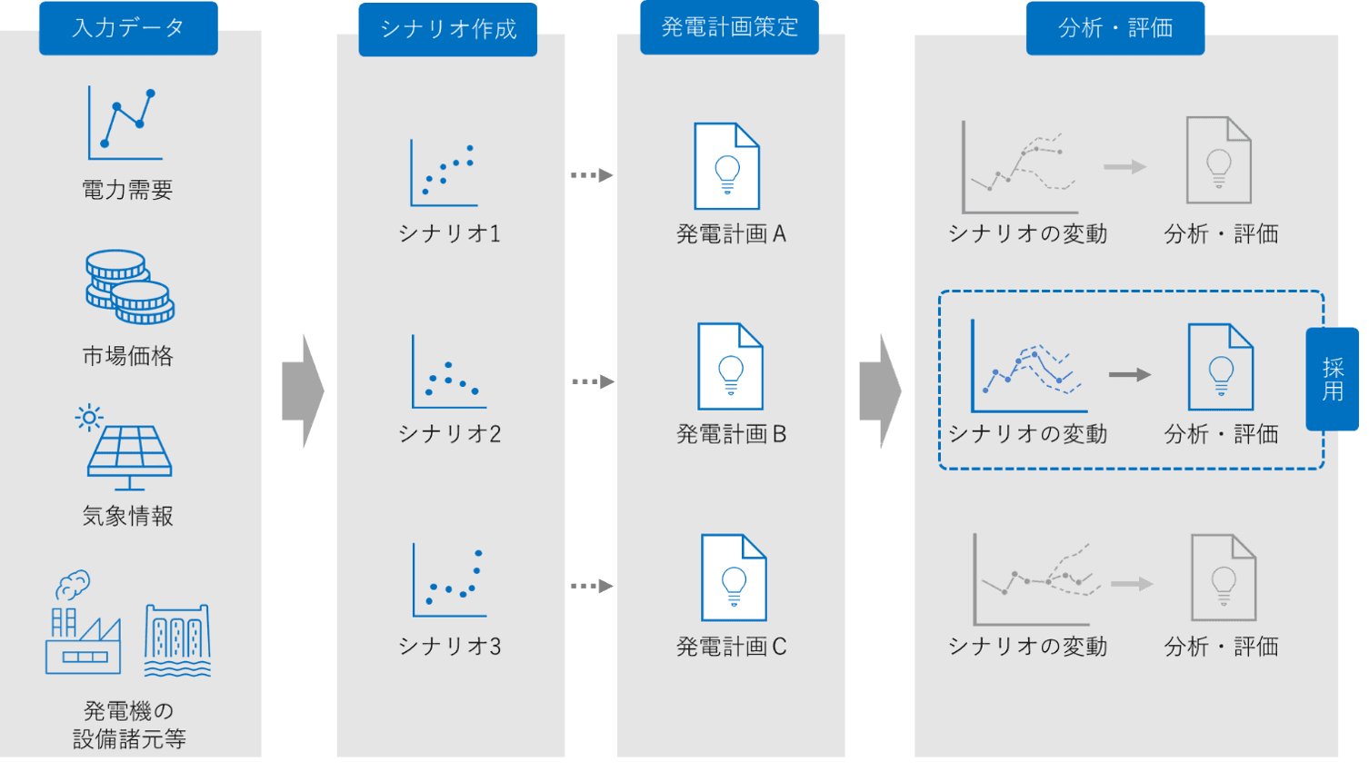 四国電力株式会社(本店:香川県高松市、取締役社長 社長執行役員:長井 啓介、以下「四国電力」)および株式会社グリッド(本社:東京都港区、代表取締役:曽我部 完、以下「グリッド」)は、AIを活用した電力需給計画立案システムの開発を進めており、本年7月より運用を開始することといたしました。 電力需給計画の立案においては、電力需要や卸電力市場価格、再生可能エネルギーの発電量など各種データの変動に対する影響を適切に評価することが不可欠であり、電力取引を巡る新たな市場が導入されたこと等により、最も経済的な電力需給計画を策定する作業がより複雑化・高度化してきています。 こうした課題を解決するために、四国電力の需給運用に関するノウハウと、グリッドのエネルギー分野に特化したデジタルツイン※・AI最適化開発プラットフォーム「ReNom Power(リノーム パワー)」を組み合わせ、AIによる電力需給計画の最適化・自動化に向けた開発を令和2年12月より進めており、このたび、実際の需給状況を反映した試運用において十分な効果が得られることを確認いたしました。 本システムについては、本年7月より運用を開始し、今後も、新たな知見を取り込みながら本システムを進化させ、更なる電力需給運用の効率化に取り組んでまいります。 ※「デジタルツイン」とは、仮想空間上に現実空間を再現する技術のこと。 AIを活用した電力需給計画立案システムの概要 本システムは、仮想空間上に現実空間を再現するデジタルツインの技術とAI最適化技術を活用し、複雑化する電力需給計画の最適化を可能にするシステムです。 本システムの主要機能 ・シナリオ作成機能 週間計画において、想定される電力需要、市場価格、気象情報などの入力データから、電力需要や卸電力市場価格、再生可能エネルギー発電量の変動を考慮した、複数のシナリオを作成。 ・発電計画策定機能 発電機の設備諸元や制約条件※等を踏まえ、シナリオごとに最適な発電計画を作成。 ・期待収益算定機能 各シナリオの最適な発電計画に対し、電力需要や卸電力市場価格、再生可能エネルギー発電量が変動した場合の期待収益を分析・評価。その結果をもとに運用者が最も経済的な発電計画を採用。 ※ 「発電機の制約条件」とは、各発電機の出力変化や起動停止、燃料消費などの制約のこと。